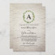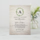 A virtual livestream covid wedding invitation featuring an illustration of a green wreath over white brick background with black text.
