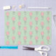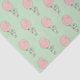 Tissue paper with a whimsical white bunny holding a big pink balloon floating up in the air. Set on a light green background.