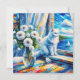 Ai art depiction of a a white cat looking out the window at a sailboat on the ocean. In front of the cat is a glass vase of white flowers. This is done in a oil painting style. Pretty coastal art for beach home or to give you that ocean breeze feeling.