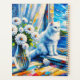 Ai art depiction of a a white cat looking out the window at a sailboat on the ocean. In front of the cat is a glass vase of white flowers. This is done in a oil painting style. Pretty coastal art for beach home or to give you that ocean breeze feeling.
