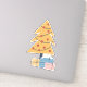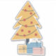A cute white cat is cozy behind some colourful yellow blue and red presents under a yellow and red Christmas tree. A fun graphic design for cat lovers, Christmas, holiday festive season, giving and receiving gifts, joy and cheer.