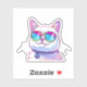 A cool white cat with stylish sunglasses. The cat's short, pristine fur adds to its air of attitude and coolness, perfectly complementing the dynamic and colourful sunglasses.