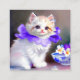 Enclosure Cards featuring a gorgeous white kitten! A fluffy kitten wears a purple flower collar. A blue bowl of white and purple flowers sits to the right. A marvellous gift for cat lovers and Victorian art enthusiasts!