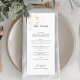 This chic and stylish wedding menu features a contemporary set of fonts and script elements against a white background, alongside delicate floral outlines in faux gold.