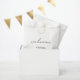 Chic and elegant 'welcome' wedding bag, featuring couple names in a contemporary set of neutral blackish fonts against a crisp white background. This item forms part of a wedding suite containing invitations and stationary in a variety of neutral mix and match items.
