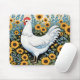 A white hen surrounded by bright yellow sunflowers, in folk art style, creates a beautiful country mouse pad. Perfect for anyone who loves chickens, gardens, and nature.