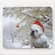 An image of a white bulldog in a "Santa hat" against a background of a wintry snow scene.