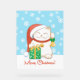 Smiling white cat in a traditional red Christmas hat holding a large wrapped present is wishing everyone a very Merry Christmas! In its left paw the cat is holding high a golden bell with a green bow.