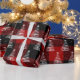 White star holiday tree in snowflakes with sparkling stars on red and black buffalo plaid.