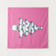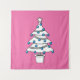 An illustration of an elegant chic white Christmas tree with plenty of blue hanging balls in pink background. This design is for people who loves Christmas, giving gifts and giveaways.