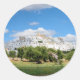 Round sticker with a landscape in Puglia, Italy, with the white city (citta bianca) Ostuni on a hill above an olive tree orchard under a cloudy sky.