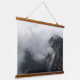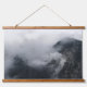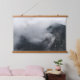 Dark, almost black and white photograph of white clouds covering rocky mountains.
