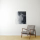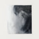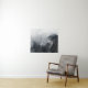 Dark, almost black and white photograph of white clouds covering rocky mountains.