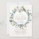 This elegant first holy communion invitation features a natural white background with a wreath of cotton flowers, blue green foliages / leaves / greeneries, and faux gold berries. The reverse side features a light beige background with honeycomb patterns. Change the background colour and personalize it for your needs. You can find matching products at my store.