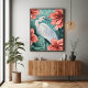 A white egret stands gracefully amidst a vibrant tropical backdrop. Its plumage is a stark contrast to the lush green foliage and the large, coral-coloured hibiscus flowers that frame the bird. The egret's long, slender legs and elegant neck are highlighted against the teal-green background, creating a sense of tranquillity and serenity.