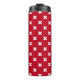 White cross stitches on red thermal tumbler