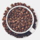 White cup full of roasted coffee beans on saucer over wooden surface. View from above