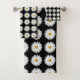 Bath towel set that features a photo image of a pretty, white Daisy flower with yellow centre on a black background and printed in a tiled pattern. A lovely, floral design! Order towels separately or as a set.