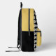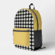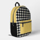 Travel with this stylish and trendy backpack that features the image of a white Daisy flower with yellow centre on a black background and printed in a tiled pattern on front side only. A fun, floral design! Top and zippered pouch of backpack are a solid yellow colour. Sides and back are black. You may customize your backpack colours as desired.
