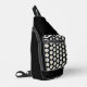 This black crossbody sling bag with zippered pocket goes where you go when biking and hiking and features on the front, zippered pocket the image of a white Daisy flower printed in a repeating pattern on a solid, black background. A fun, floral design!