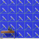 The design features a close-up photograph of a white daisy flower on a blue background, presented in an elegant, squared tile pattern.