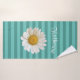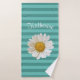 A close-up photo of a white daisy with custom name on a teal striped background.