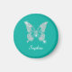 Personalize white script name on classy white diamond butterfly design with teal background.