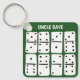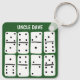 Add a name or a custom message to create the perfect personalized keychain for fans of playing dominoes and other games. This key chain features simple, hand-drawn style illustrations of white dominoes with black dots and printing against a green background.
