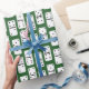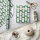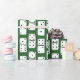 Simple hand-drawn style illustrations of dominoes in white with black printing or dots on them are arranged in a pattern against a green background on this wrapping paper. It's perfect for anyone who loves playing dominoes and other games.