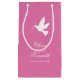 Give your wedding gifts in this special wedding gift bag personalized with your bride and grooms name. Perfect to add a personalized touch to your wedding gifts to your wedding party or when giving wine. A simple graphic dove outline with two pink ribbons art gift bag in white and pink. Matches a range of other wedding products in the dove range. Customize / personalize these gift bags with your own bride and grooms names and wedding date on both sides. Original art and design by Sarah Trett.