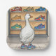 A duck stands in a shoe store, wearing bright pink and blue sneakers while gazing at a display of colourful sneakers