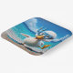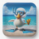 A cheerful duck stands on a sandy beach wearing a pair of blue flippers, snorkel, and goggles with ocean background.
