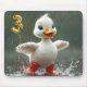 A cheerful white duckling wearing red rain boots splashes joyfully in puddles while holding a shiny gold "3" balloon
