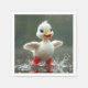 A happy white duckling wearing red rain boots splashes joyfully in a rain puddle