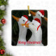 Square, ceramic ornament that features a whimsical photo image of white ducks with orange bills wearing red Santa hat, wishing one a Merry Christmas. Image printed on one side. A fun, holiday design!