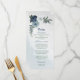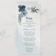 Beautiful romantic white, dusty blue and navy blue flowers with green leaves botanical wedding menu.