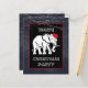 A black background, with a white elephant wearing a Christmas hat and white text in a black frame. The back