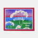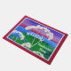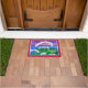 Minimalist custom doormat in greens and blues with stylized elm trees in the foreground.