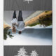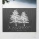 White embossed trees on grey wood grain rustic winter wedding tri-fold invitation. A rustic winter wedding design that showcases two white conifer trees in embossed relief effect on the front cover and the names of the couple in a decorative font. A photo of the couple covers the outside back.