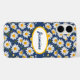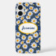 Cute, little, white daisies with bright yellow centres on a blue background creates a simple and sweet iPhone case. Personalize with your name in a yellow-bordered oval held by a dark blue band.