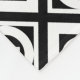 Bold geometric pattern features alternating thick and thin white diamonds with space between them on a black background. The thick diamonds each contain a thin white circle with a thick white equal sign at an angle inside. In contrast, the thin diamonds each contain a thick white circle that touches its edges with a thin tilted white equal sign inside.
