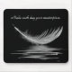 Single white feather floating on black rippled water reflection with inspirational quote.