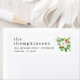 White Floral Foliage Name Return Address Christmas. For your holiday mailings, an elegant bouquet of christmassy white florals, red berries and christmassy greenery is to the top right with text to the left. Your name is larger in stylish lowercase with your return address beneath. Easily personalise the text.