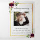 An elegant tri-fold program. A white background, a faux gold frame, burgundy florals and space for your photo. Personalize and add name, dates and your text.