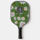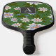 This cute pickleball paddle features a monogram and your name/text on a green background with white floral patterns. Personalize it for your needs.