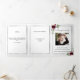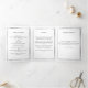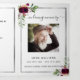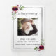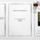 An elegant tri-fold program. A white background, a faux silver frame, burgundy florals and space for your photo. Personalize and add name, dates and your text.