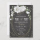 Beautiful white flowers with some green leaves on oval frame against black background wedding invitation