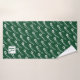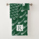 White small flowers on emerald green floral bath towel set. It showcases a pattern of small flowers and leaves and your monogram on green background.