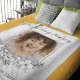 In loving memory blanket in white with flowers and greenery framing a photo of your loved one.