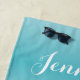 This beach towel features Destei's original illustration of a lovely white frangipani flower with two green leaves. The background colour is blue with a sand pattern on the bottom. On the top there is a personalizable text area for a name in a beautiful script font.